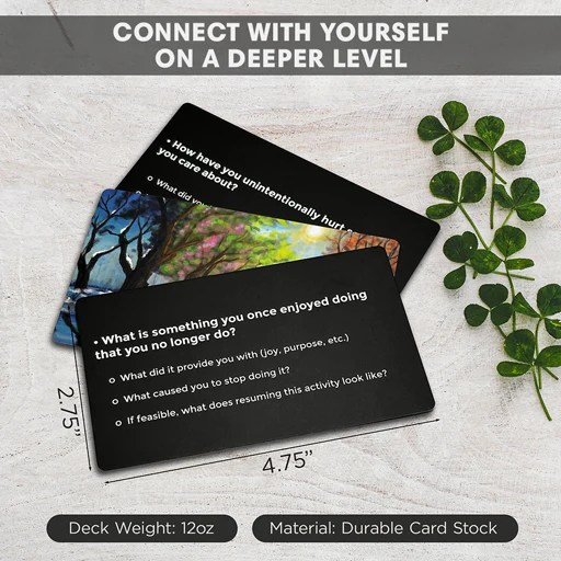 Each card is cleanly printed with several questions, each intended to prompt a deeper consideration of who you are and who you truly want to be.